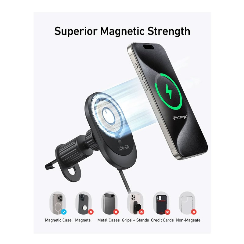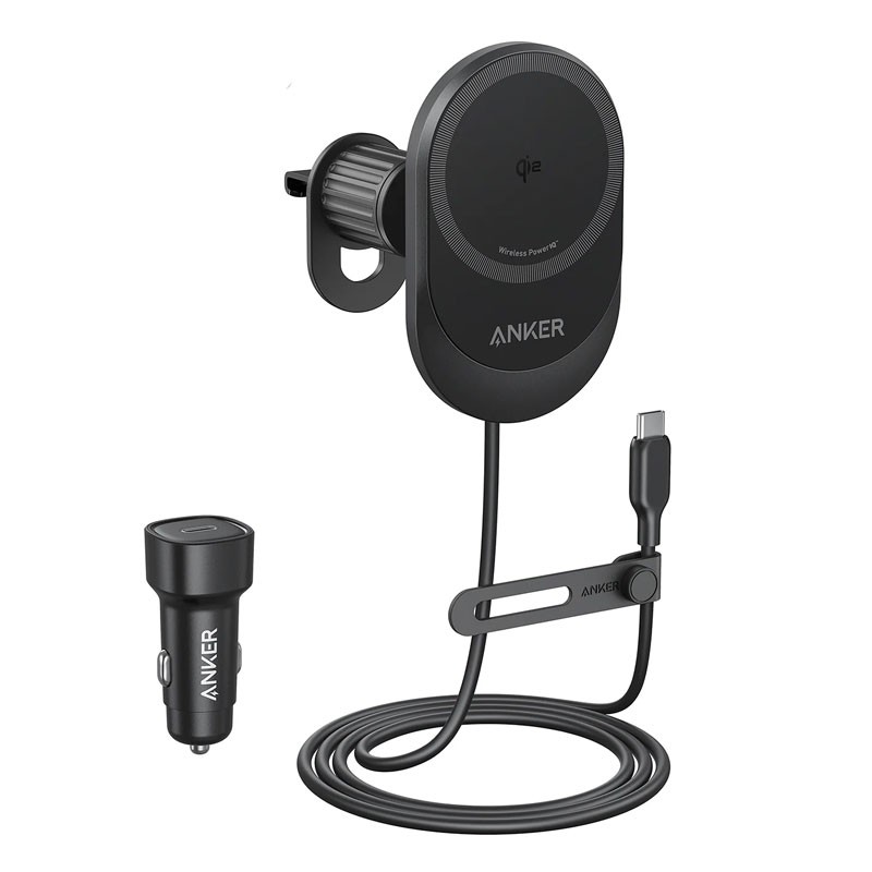 Anker MagGo, 360 Degree Adjustable Angle And Strong Magnets, Car Phone Holder Mount, Wireless Car Charger, Pad, Built In USB C Cable, B2932111