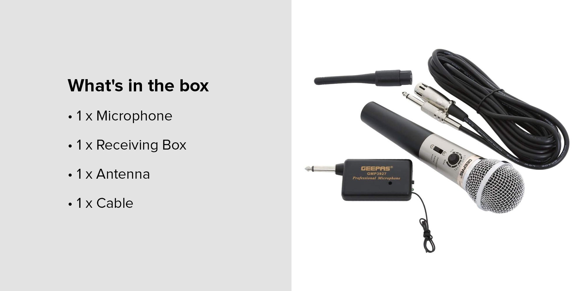 What's In The Box | 1x Microphone, 1x Receiving Box, 1x Antenna, 1x Cable |