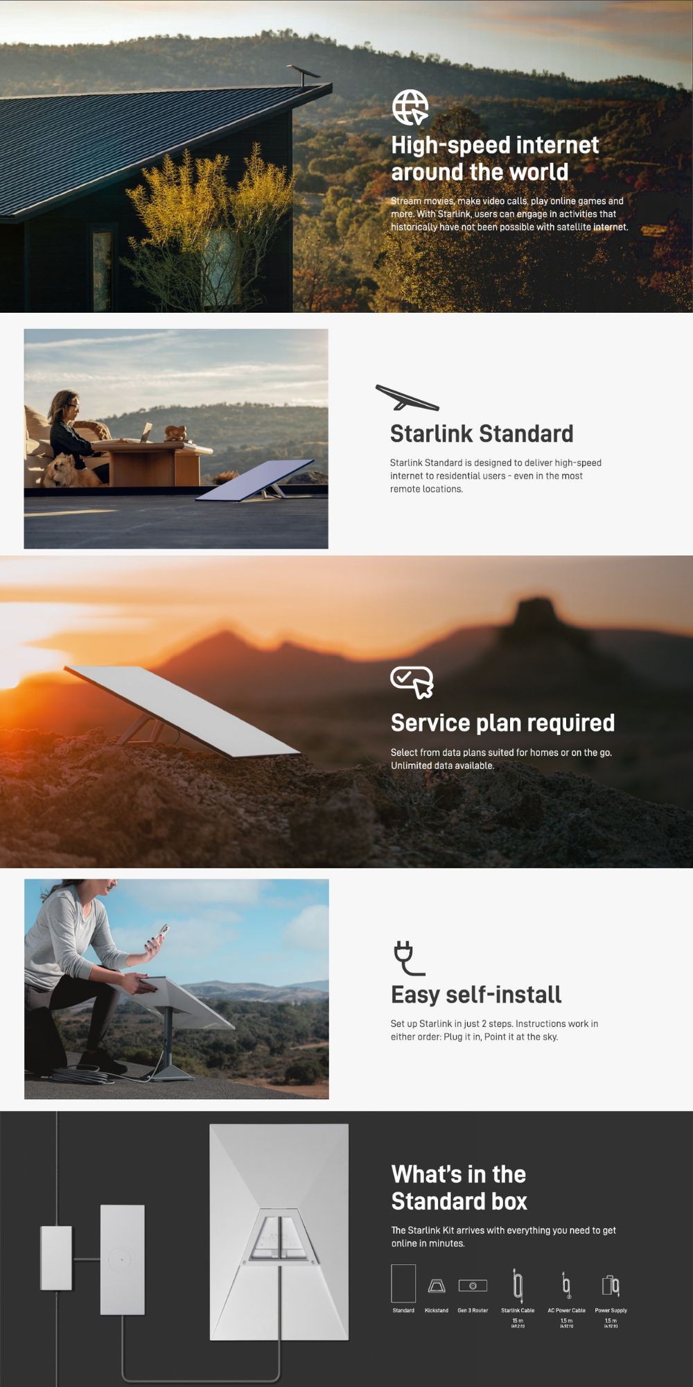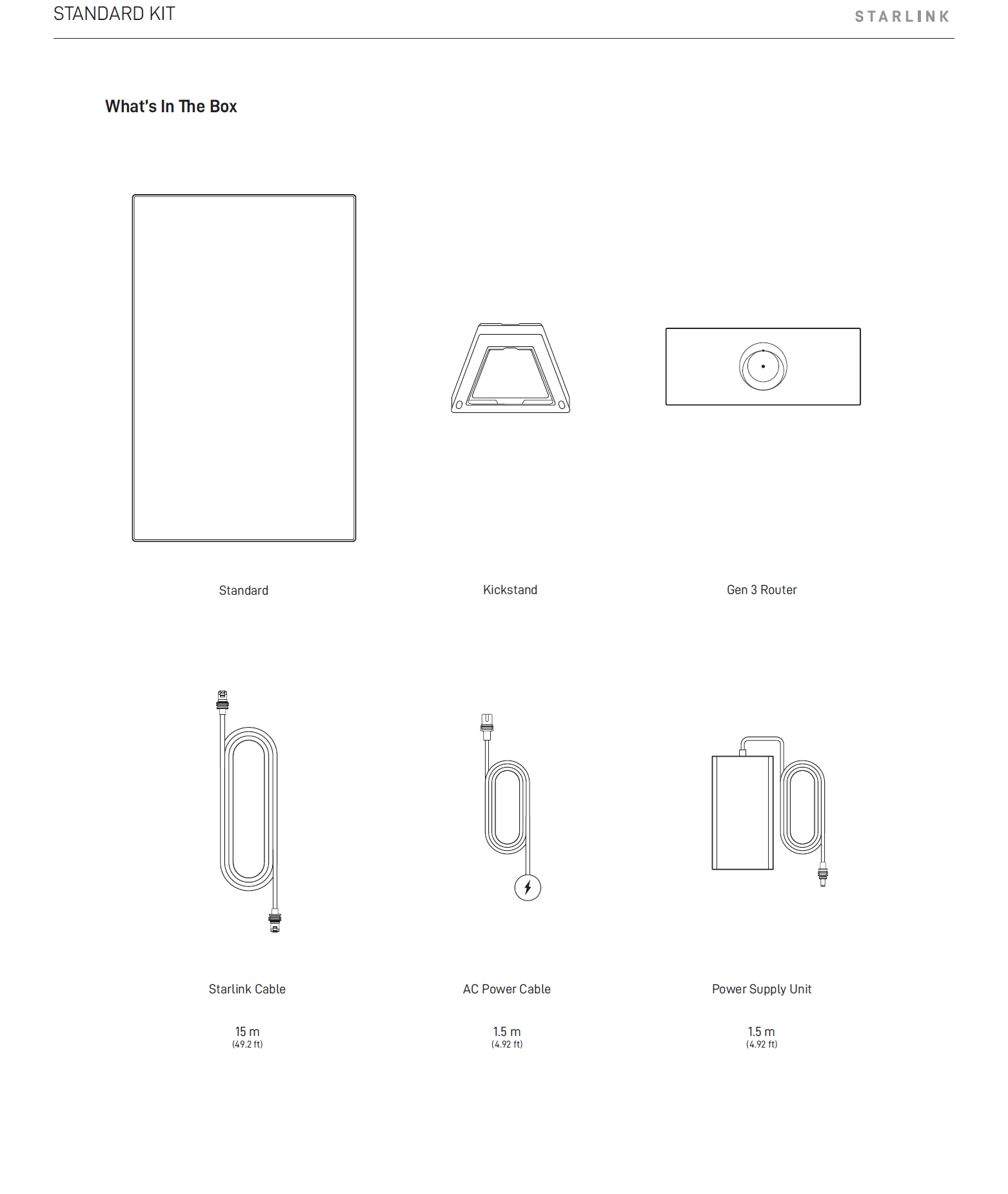 | Includes | Starlink Dish (Gen 4), WiFi 6 Router, Power Supply, 15m Cable, Mounting Base |